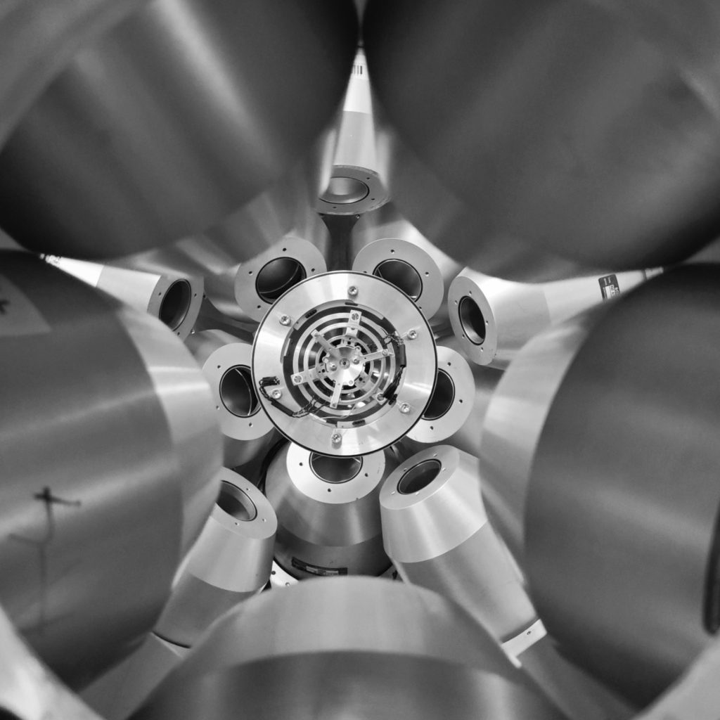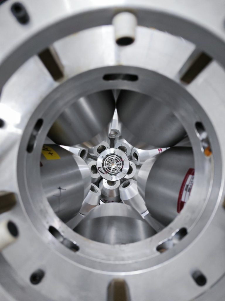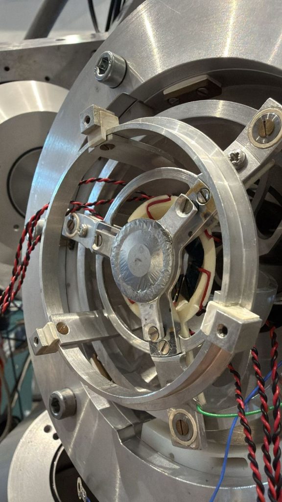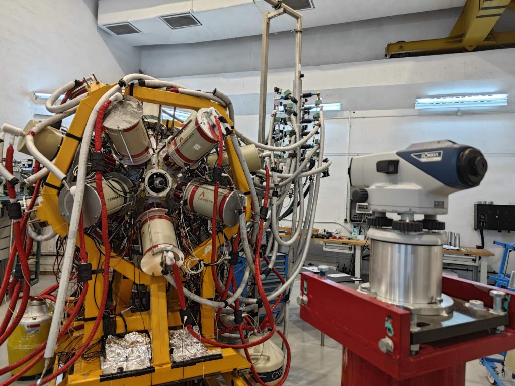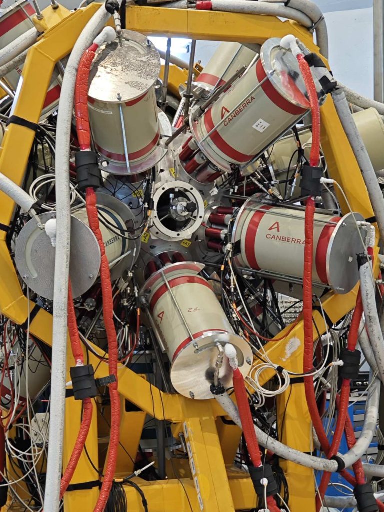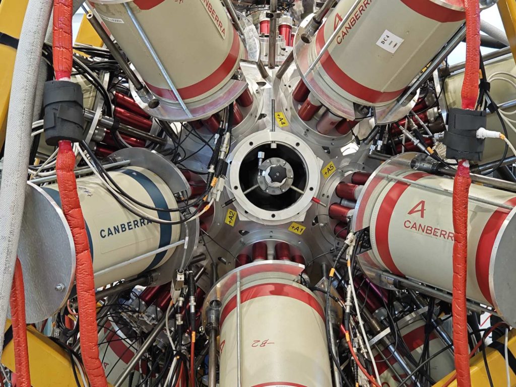 В периода 17-27 ноември 2025, в изпълнение на Работен Пакет 8, задача 8.4., проведохме експеримент за измерване на времена на живот на възбудени ядрени състояния в ядрата на 109Ag, получени като продукт на ядрена реакция. За целта, сноп от 13C беше ускорен от 9 MV тандемен ускорител на румънския център за ядрени изследвания IFIN-HH, намиращ се край столицата Букурещ. В реакции на ядрата от снопа с ядра от молибденова мишена обогатена до 99% на 100Mo, се получават високовъзбудени съставни ядра на 113Cd, които впоследствие се разпадат чрез излъчване на неутрони, протони или алфа частици, и високоенергетично електромагнитно лъчение (гама кванти). В един от тези канали, като краен продукт се получава 109Ag. Пикосекундни времена на живот (една хилядна от една милярдна част от секундата) бяха измерени използвайки информация за доплеровото отмесване на енергиите на гама квантите, излъчени в полет. Експериментът е част от кампанията със стабилни снопове, която провеждаме от няколко години в центъра за ядрени изследвания IFIN-HH.
